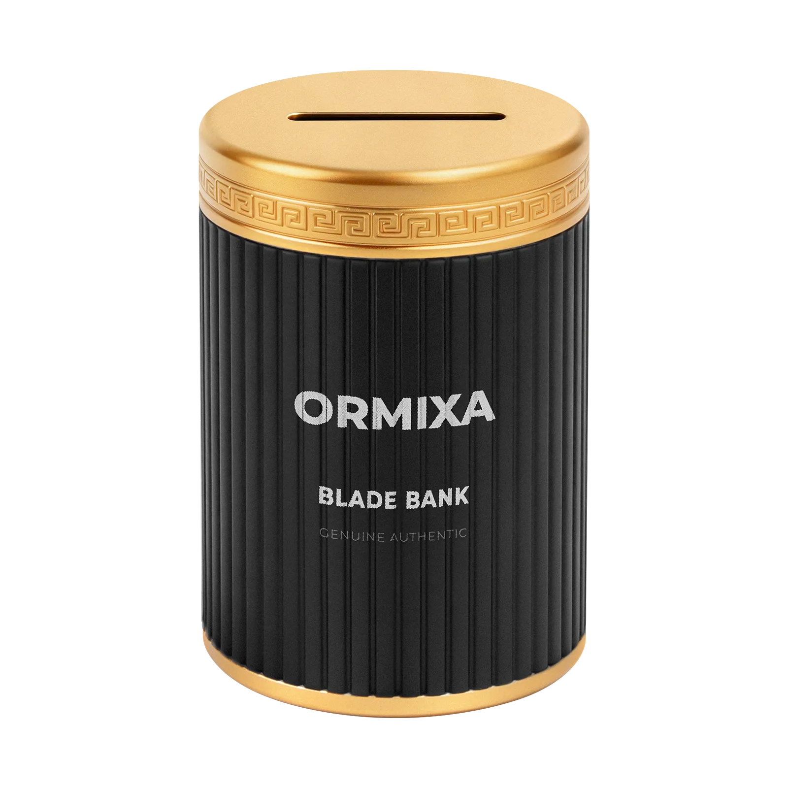 Safe, permanent storage for used double-edge blades. Drop them in through the top slot — the sealed aluminum body means they never come out.
